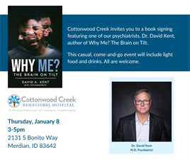 Cottonwood Creek Behavioral Hospital is proud to invite our community to a special book signing with Dr. David Kent, one of our psychiatrists and the author of Why Me? The Brain on Tilt.